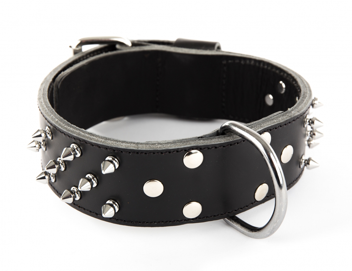 Collier cuir pleine fleur clouté. Assemblage piqué. Accessoire en métal. Dimensions : 65cm.