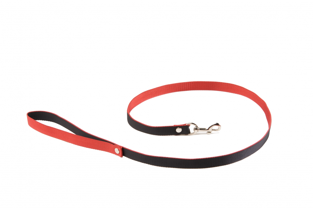 Laisse nylon bicolore rouge & noir.Rivets double tête. Dimensions : 40mm x 100cm.