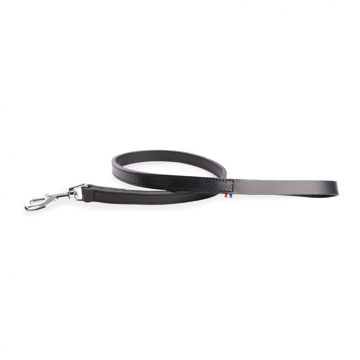 Black leather lead for dog. Carabiner carbine. Assembling dive. Metal buckles. Double thickness of leather. Full grain leather. Made in France.