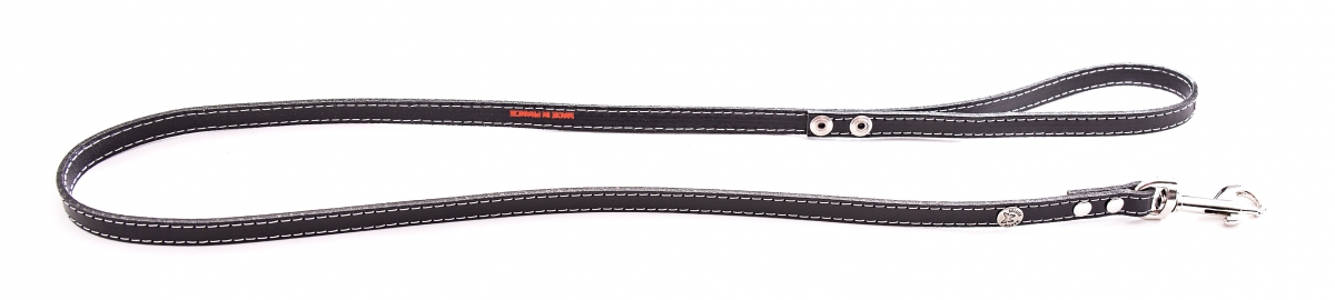 Black leather lead for dog. Classic leather stitched with plate. Leave classic leather stitched cut franc. Rivet mounting. Carabiner carbine. Leather full flower. Made in France.