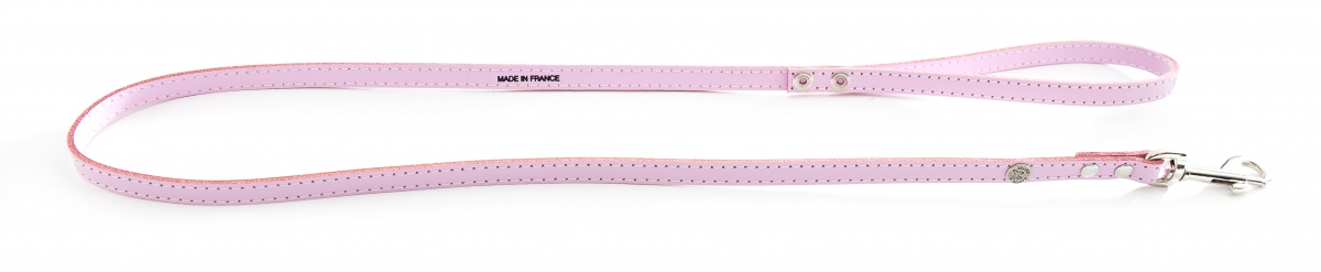 Pink leather lead for dog. Classic leather stitched with plate. Leave classic leather stitched cut franc. Rivet mounting. Carabiner carbine. Leather full flower. Made in France.