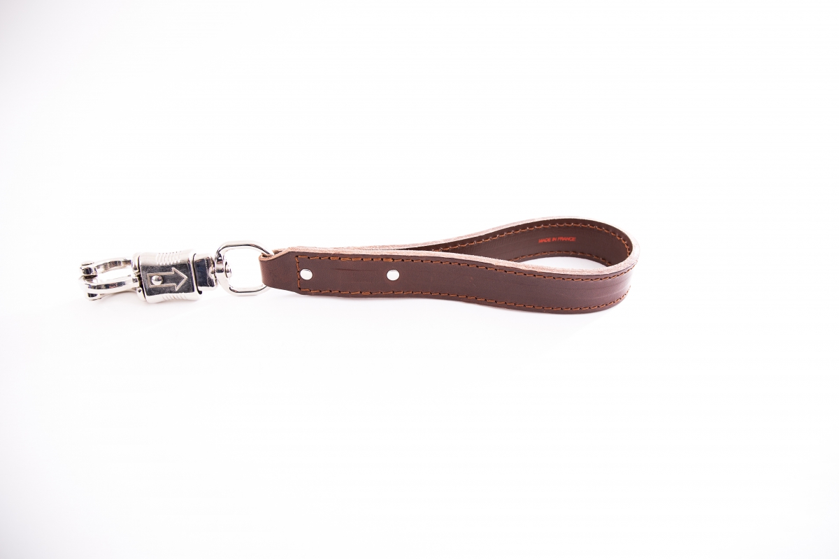 Dog lead brown handle. Leashes assorted Collars with leather saddle stitching. Full grain leather doubled. Carabiner panic. Made in France. Width 30mm Length 30cm