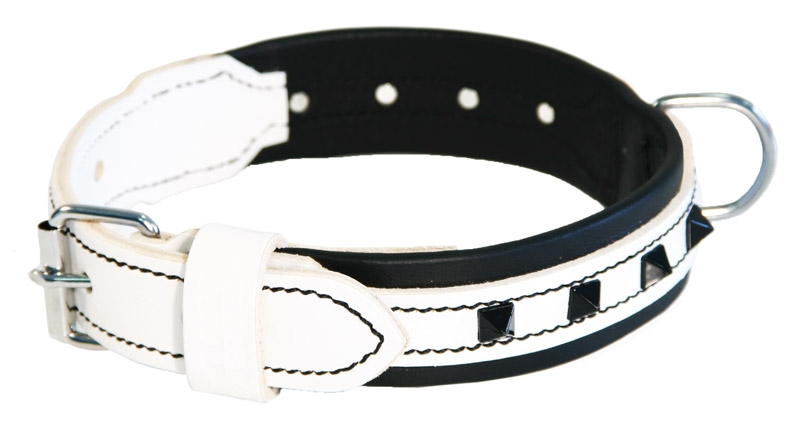 Collar of the Montana range. Full grain leather. Lined in soft lambskin (black or beige depending on model). Natural vegetable tanning. Assembling dive. Adorned with studded decorations. Buckles in chromed steel. Made in France.