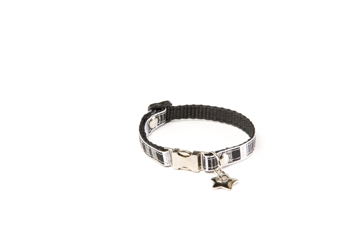 Size XS - Width 10 mm Length 18-28 cm. Ribbon mounted on strap. Double rivet head. Self-locking Buckle made of metal. Pendant. Made in France.