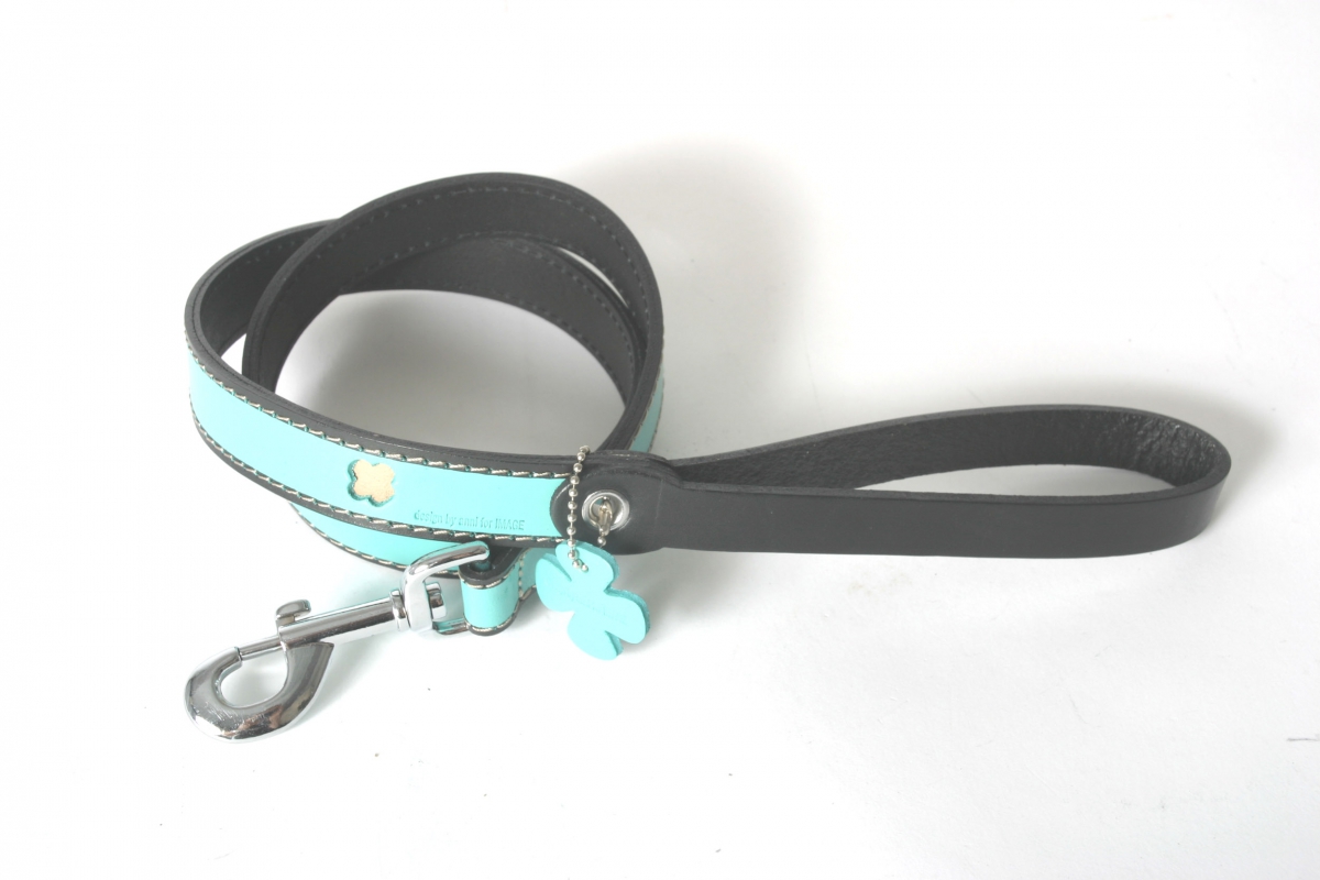 Leather coin shaped flower Bowxy. Two-tone stitched leather. Brushed metal accessories. Carabiner carbine.