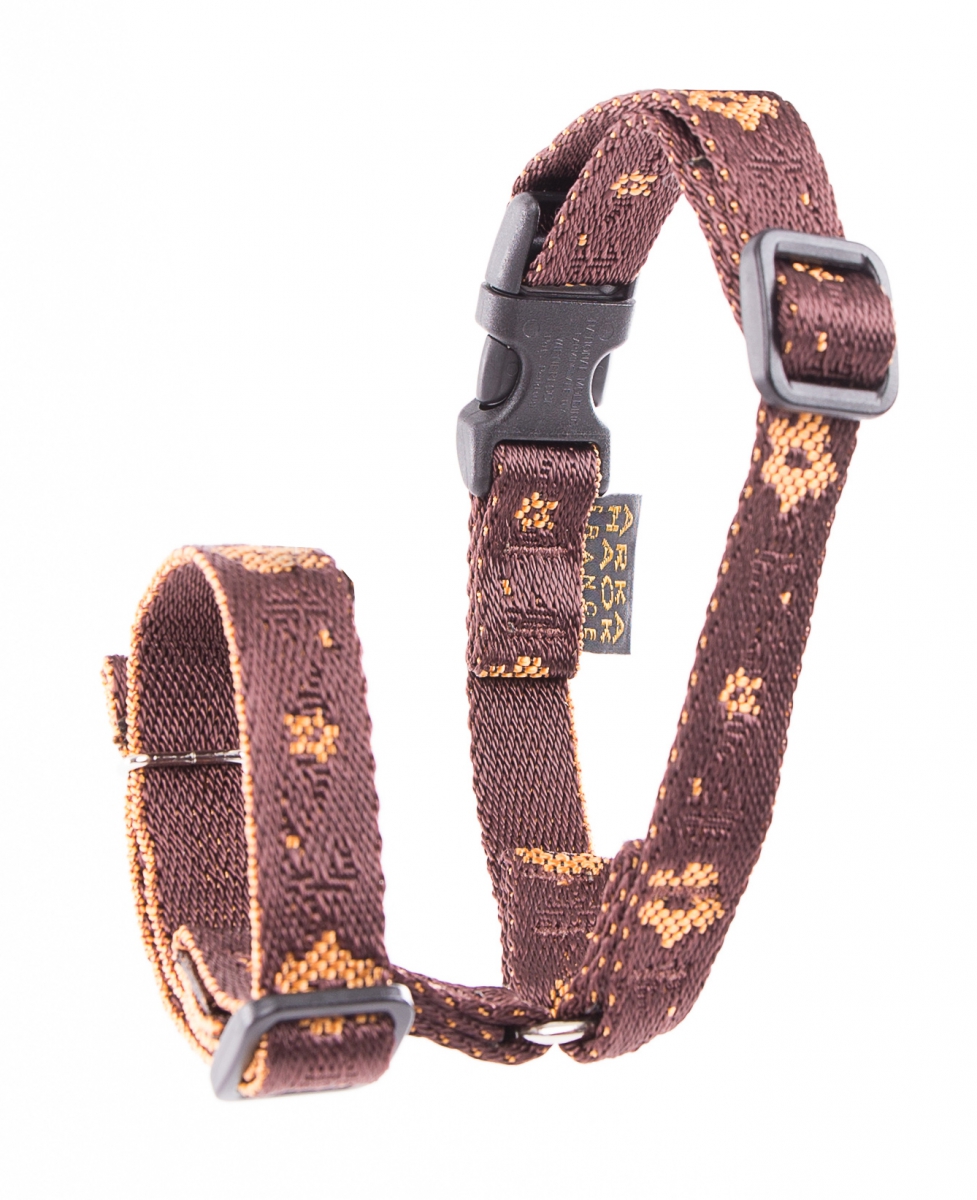 Very strong nylon webbing. Strong resistance depending on the width of the strap: 13-15 mm 600 kg 20 mm 1000 kg and 25 mm: 1200 kg, 40 mm: 2000 kg. Acetal buckles and Buckles to ensure high resistance to breakage. Drawings for exclusive woven design on the strap with tinted son in the mass. color retention to sunlight and washing at 30 ° C (do not rub). Buckles steel with nickel finish. Rembordées straps, no sharp edges in contact with the animal. Lightweight and adapted to the morphology of the animal. quick release buckle. Adjustable round muzzle and neck strap. Made in France.