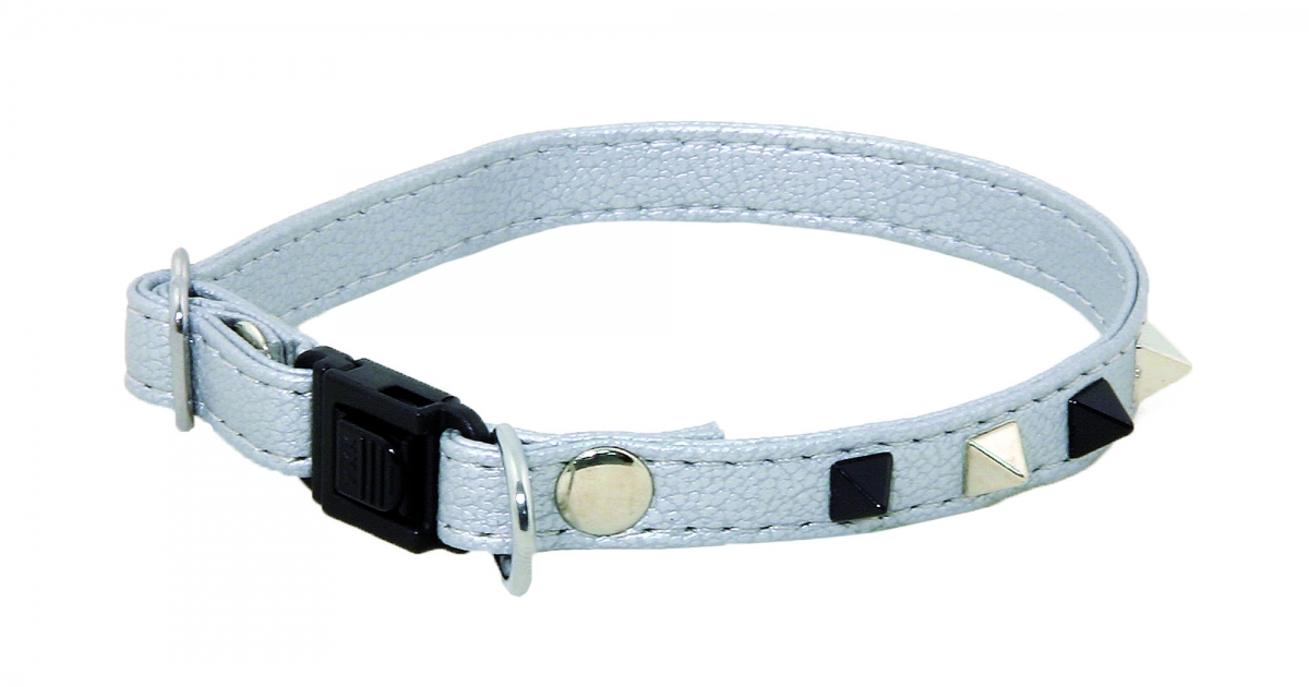 Width 10mm. Length 20 to 28 cm. Imitation leather with faux leather lining. riveted joint. Decorated with pyramid rivets. Buckles in metal and plastic. Anti-Buckle throttle safety. Made in France.