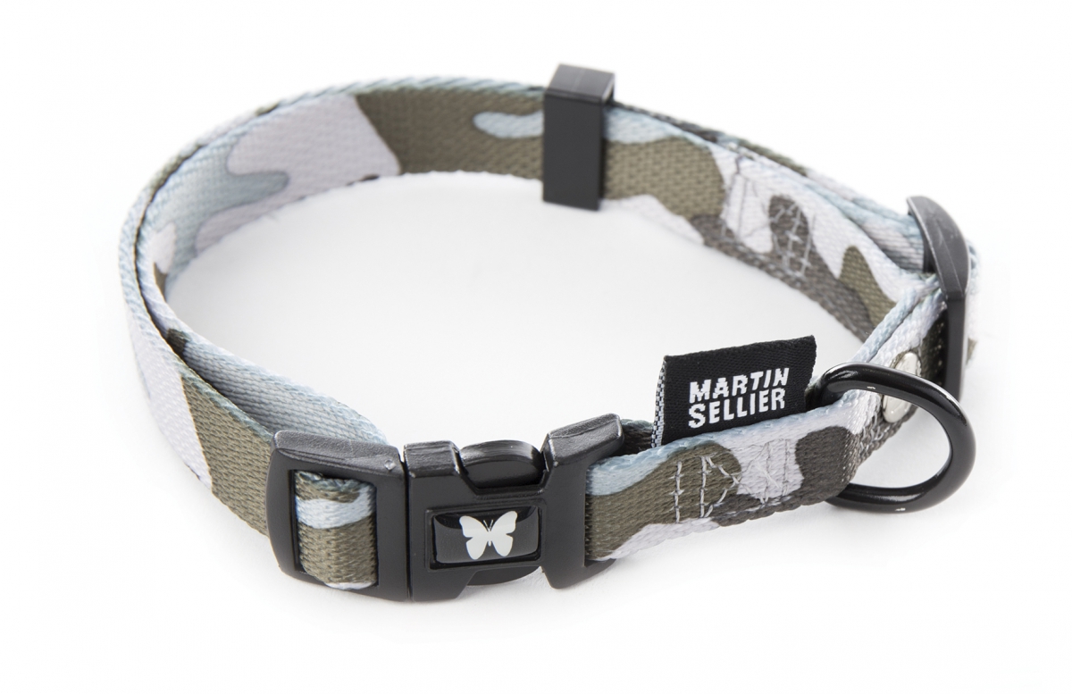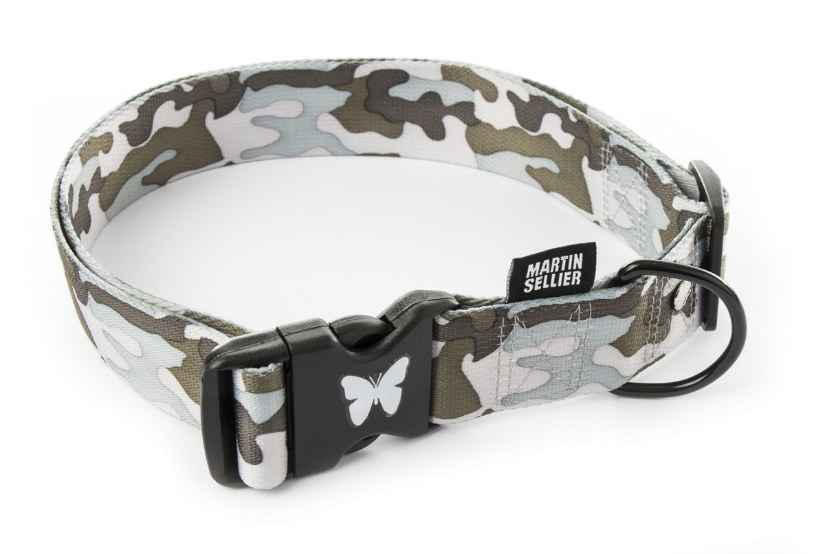 Adjustable gray “Camouflage” nylon collar for dogs.