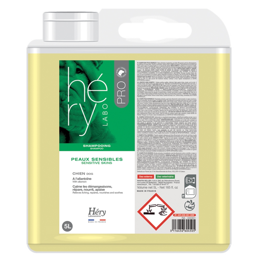 Dog shampoo, sensitive skins, Hery. Realieves itching, repaires, nourishes and soothes. With Allantoin.