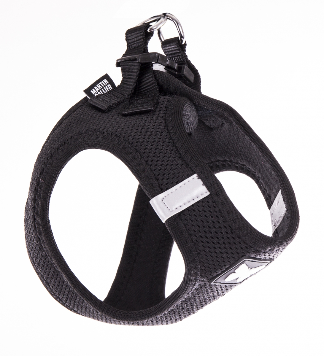 Uniform force distribution during pulls for optimal animal presentation/Velcro to adjust size/quick buckle to secure fastener/2 metal rings for attaching leash/reflective strips for animal safety/ Possibility to wet the harness to cool the animal in case of high heat/7 sizes available: 3XS, 2XS, XS, S, M, L, XL/9 colors available assorted to the nylon saddlery Martin Sellier