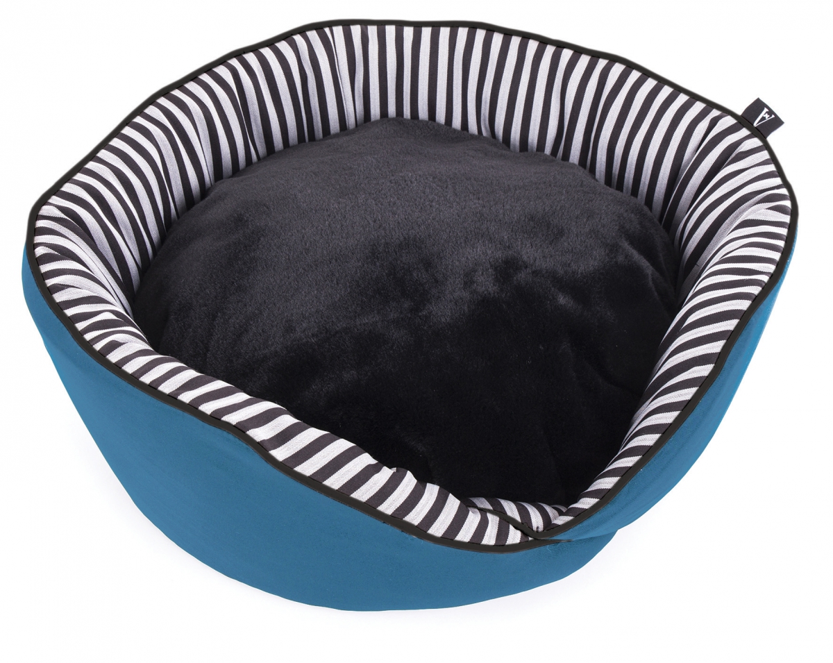 Round basket : for cats and small dogs. Borders in foam for good support, soft cushion with one face in fur and the other in striped fabric.