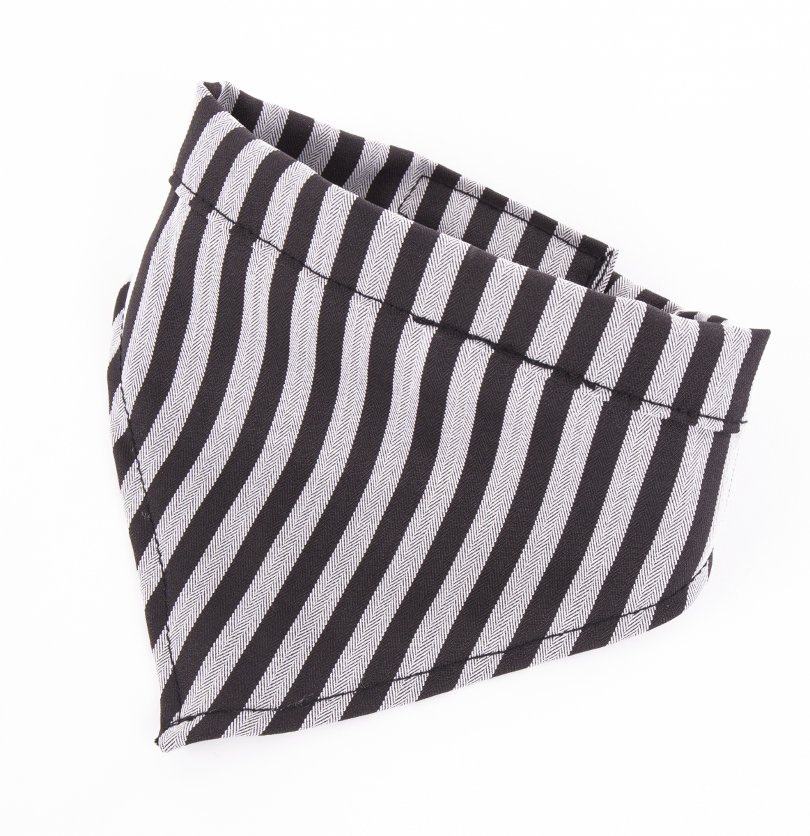 Bandana (3 sizes) : black striped fabric, delivered in a transparent plastic bowl and closed by a link in satin.