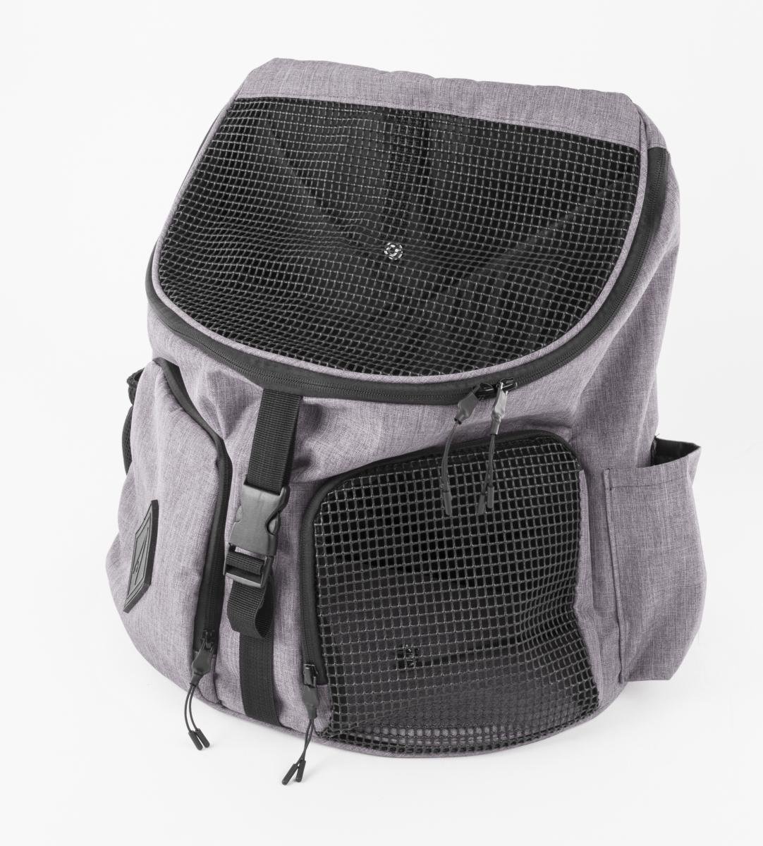 For safety: a solid net, zippers including a double one on the top and activated by a safety buckle, a strap with a carabiner inside to attach to the animal's collar.