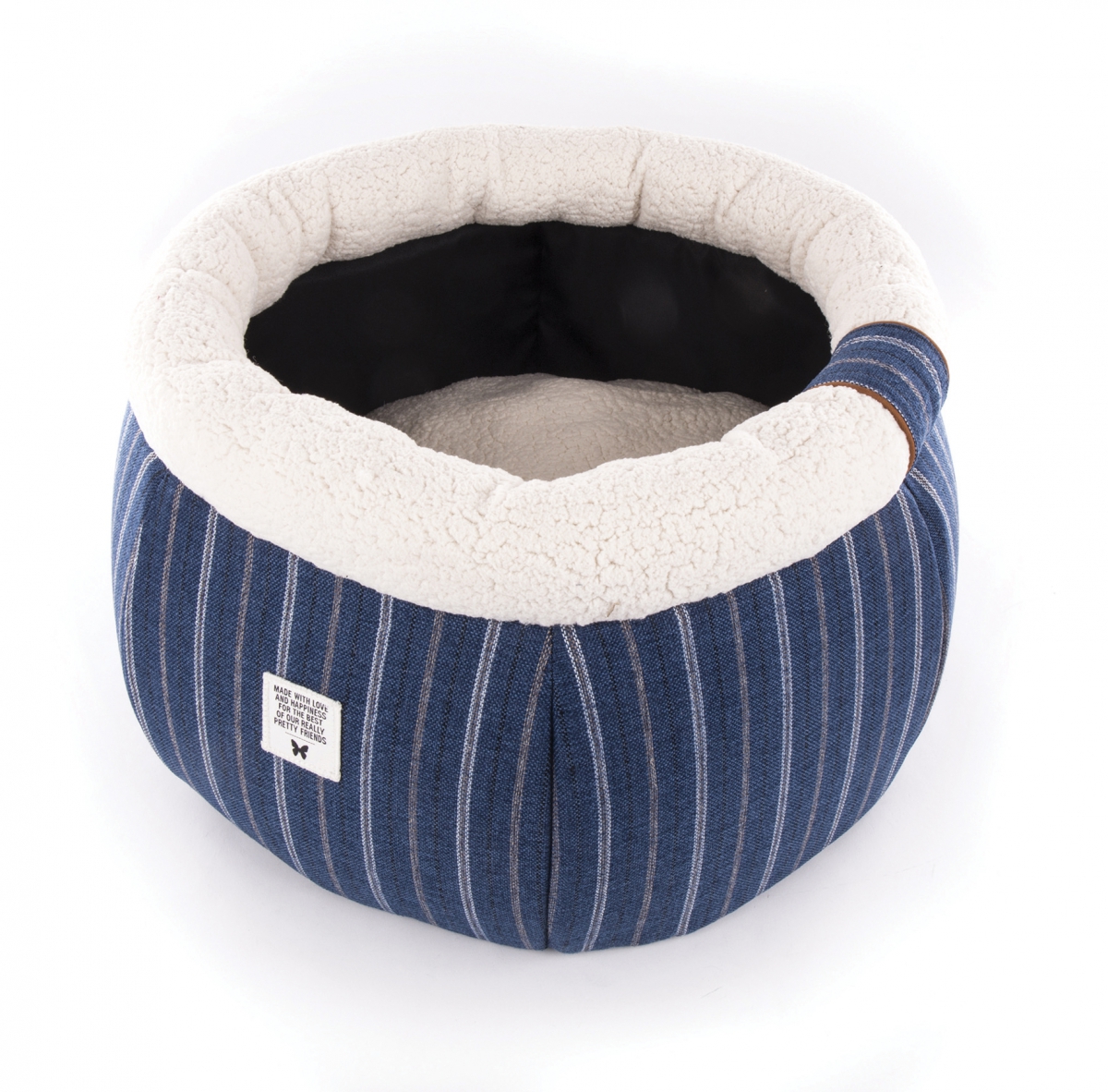 High basket (2 sizes): really high and very enveloping shape, a real refuge for cats - small dogs. Soft and removable cushion, one face in fur and the other in striped fabric. Materials: 100% polyester fabric and fur. Ouatine or foam inside: 100% polyester. Strong and easy-to-maintain fabrics, washable (30oC).