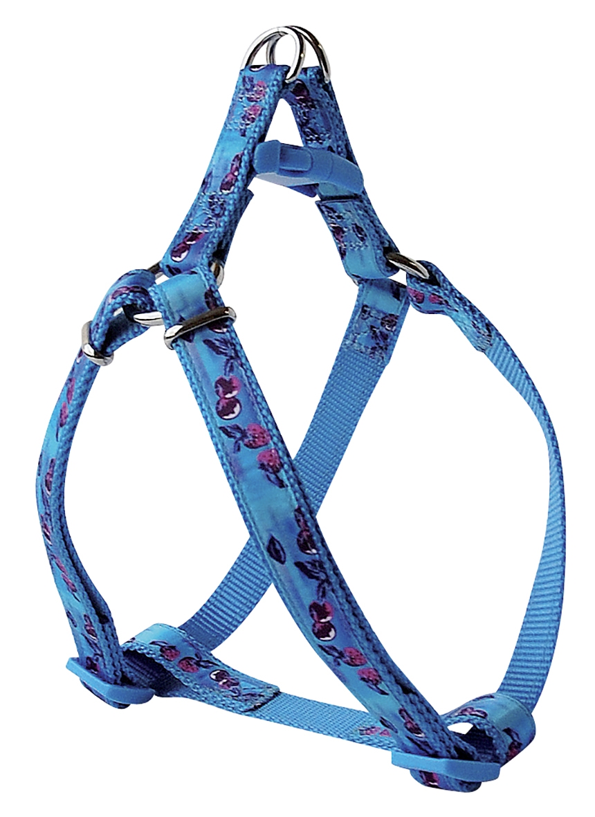Nylon fancy decorated with cherries printed on one side, plain color on the other side. Adjustable collar and harness with quick release. Harness with double safety catch.