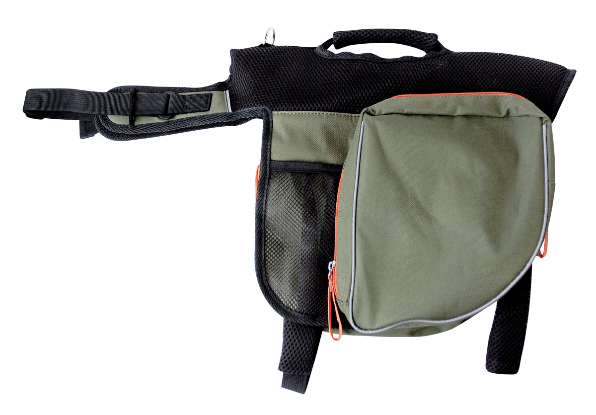 Deux grandes poches latérales, système porte bouteille, renfort sur le dos, attache sous le cou réglable de 24 cm à 44 cm , attache sous l'abdomen réglable de 24 cm à 47 cm .