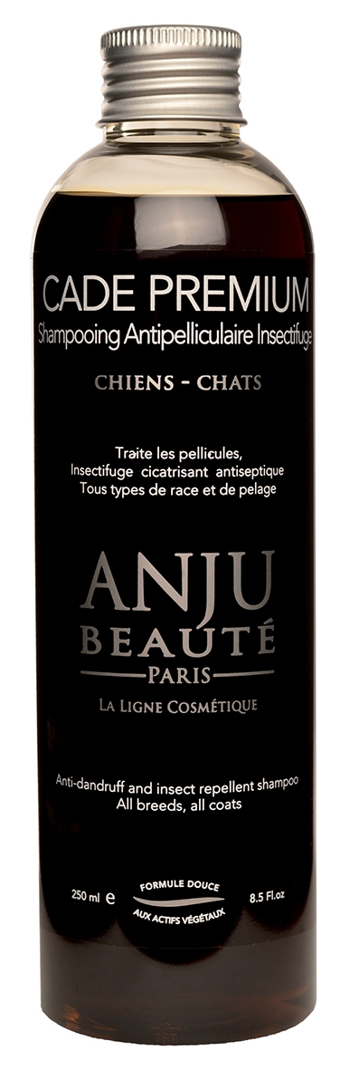Le shampooing Cade Premium de la marque Anju Beauté est un shampooing antipelliculaire insectifuge pour chien et chat. Il est notament composé d'huile de Cade, citronnelle et de vitamine B6.