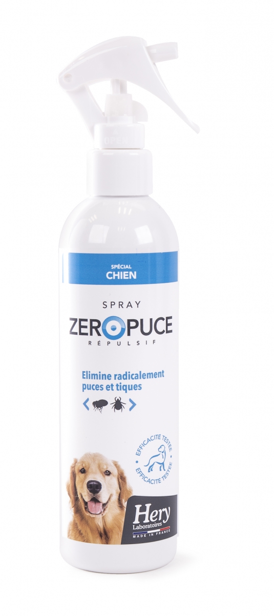 Le spray Héry Zéro puce chien éloigne efficacement les puces, les tiques et phlébotomes.