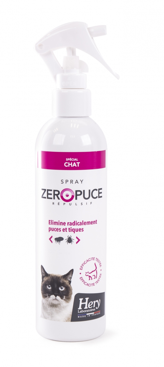 Le spray Héry Zéro Puce Chat éloigne efficacement les puces, les tiques et phlébotomes.
