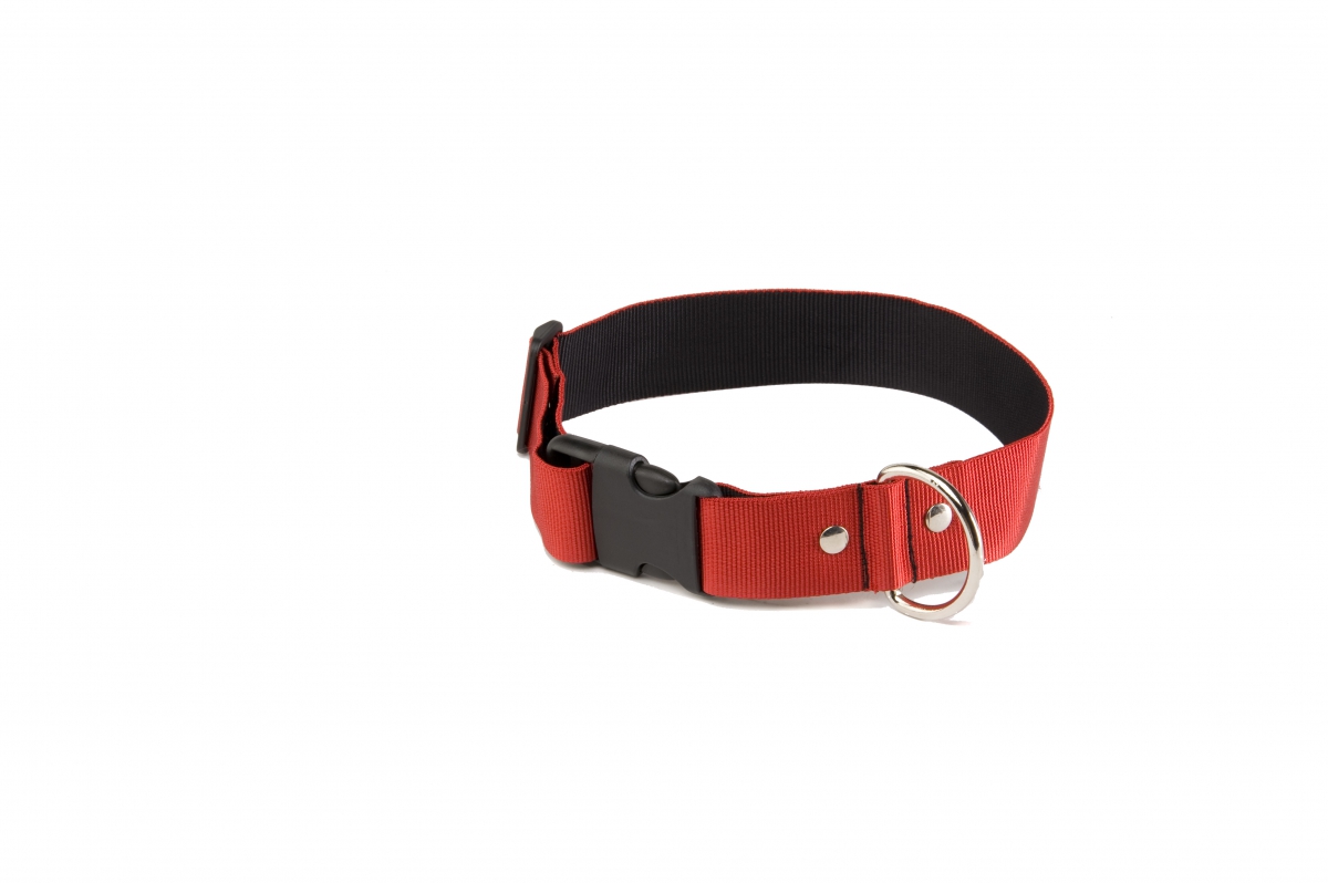 Collier nylon bicolore rouge & noir. Boucle auto-bloquante. Rivets double tête. Dimensions : 40mm x 40-64cm.