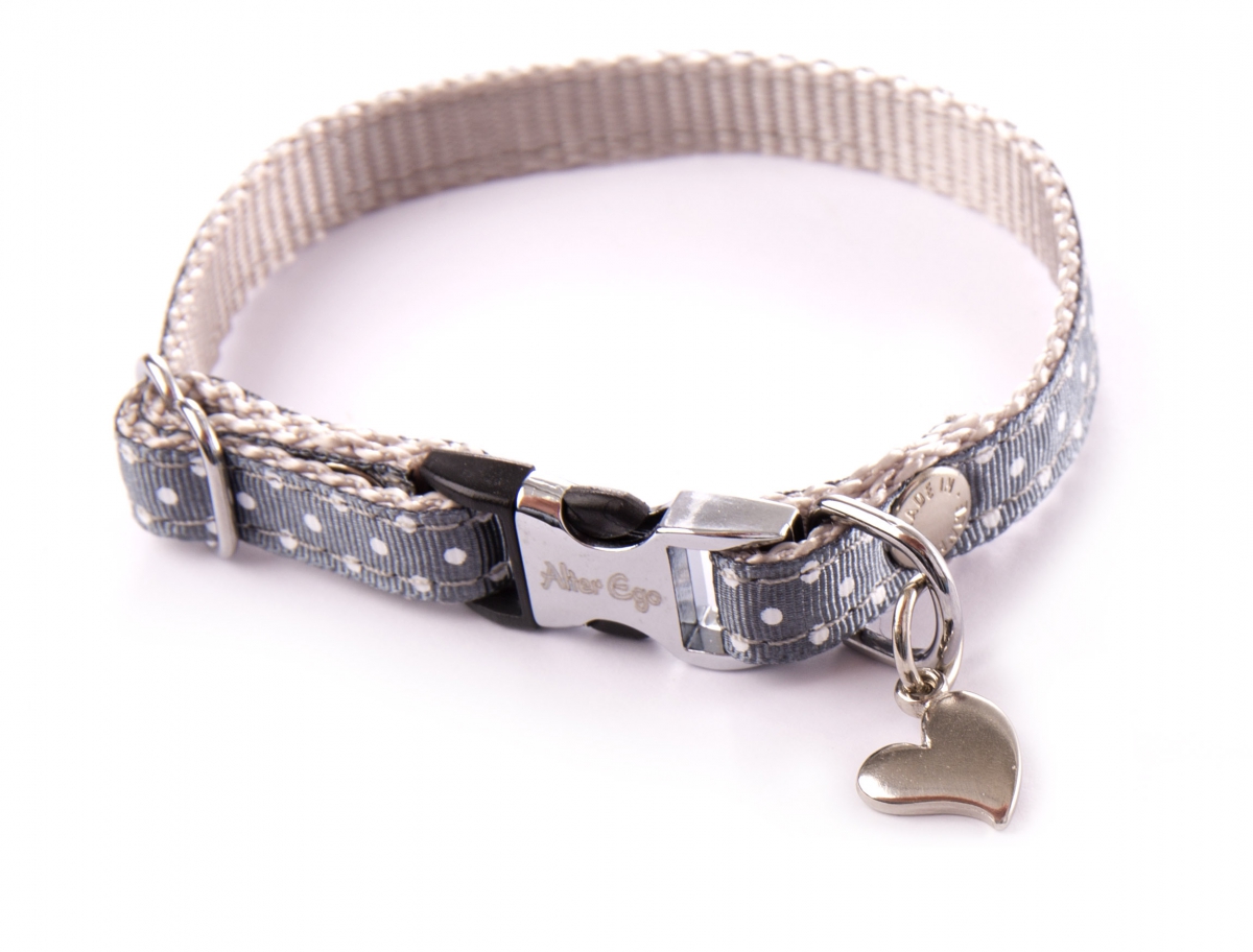 Galon motif pois cousu sur sangle nylon. Rivets double tête. Bouclerie en métal. Boucle auto-bloquante. Pendentif Coeur.