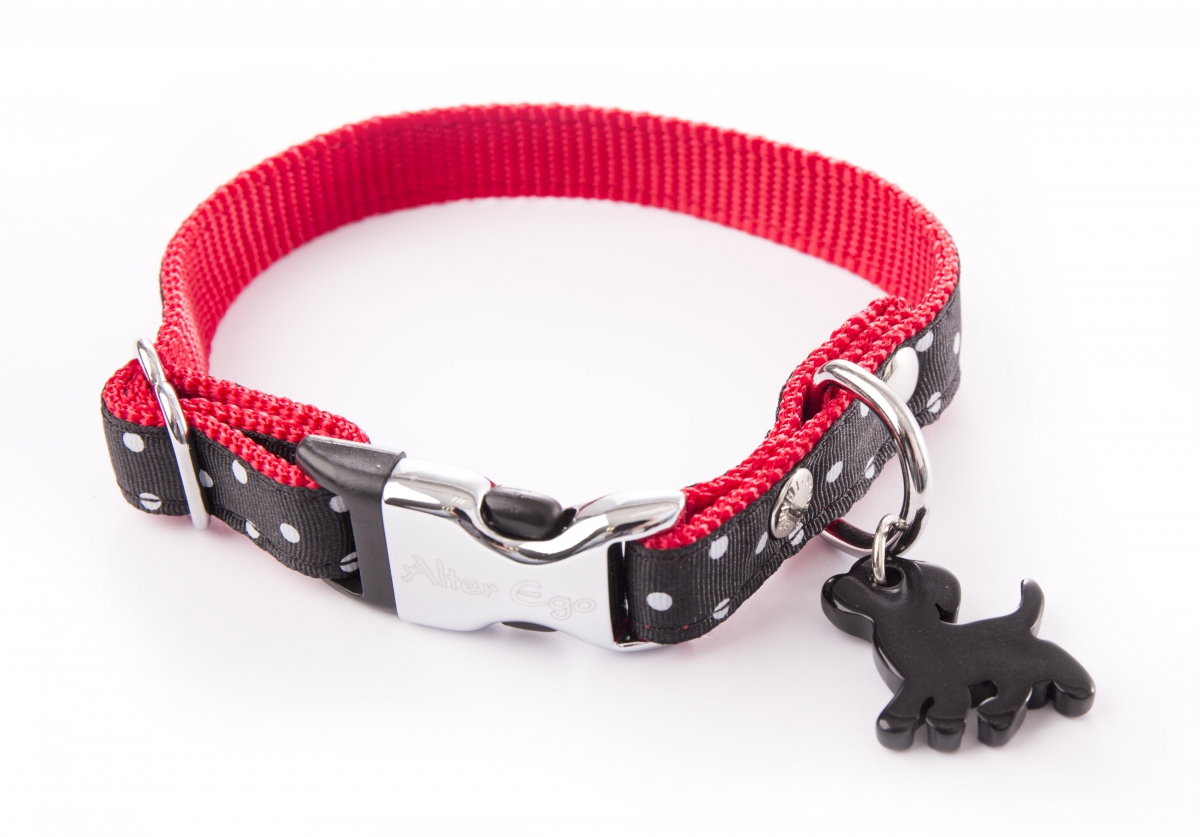 Galon motif pois cousu sur sangle nylon. Rivets double tête. Bouclerie en métal. Boucle auto-bloquante. Pendentif chien.