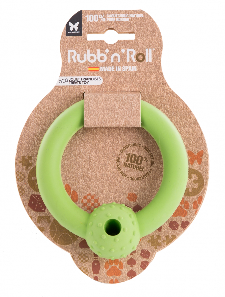 Jouet Anneau pour chien spécifique pour insérer des friandises. Satisfait le besoin de jouer et de mâcher de l'animal. En caoutchouc 100% naturel provenant de l'Hévéa. Evite les risques d'occlusion intestinale. Biodégradable et écologique.