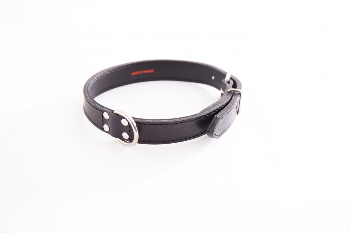 Collier en cuir noir pour chien. Cuir piqûre sellier. Cuir pleine fleur doublé piqué. Montage cousu. Bouclerie nickelée. Fabriqué en France.