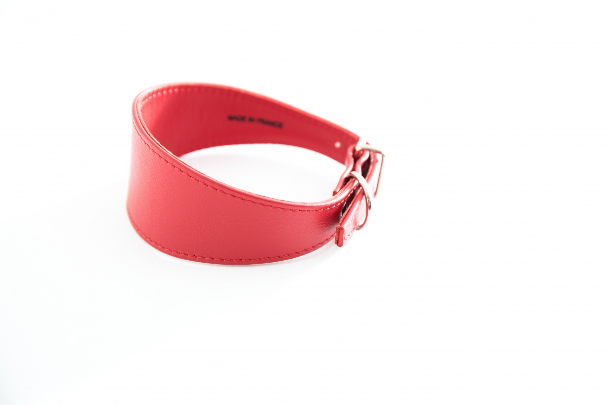 Collier Whippet et Lévrier en cuir rouge. Cuir uni peausserie. Cuir pleine fleur uni façon agneau. Bouclerie nickelée. Fabriqué en France.
