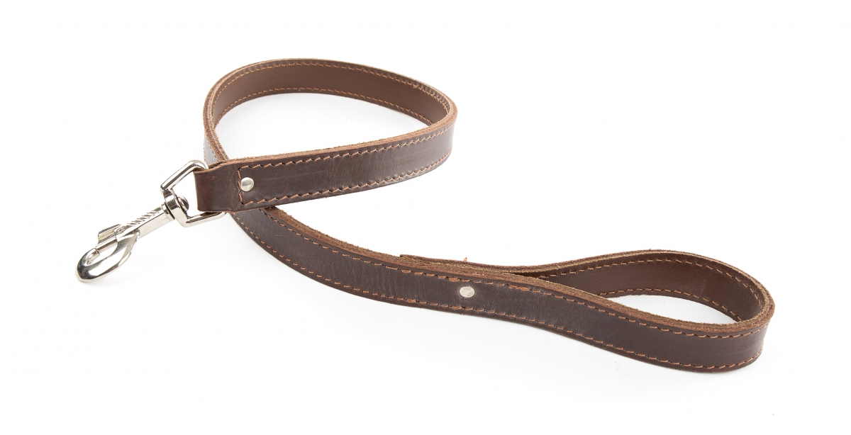 Laisse en cuir marron pour chien spécial bouledogue et molosse. Laisses assorties aux colliers cuir piqûre sellier. Cuir pleine fleur doublé. Mousqueton carabine. Fabriqué en France.
