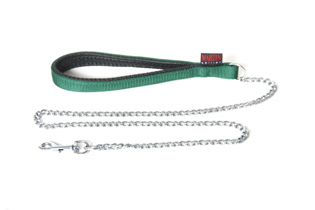 Laisse nylon et chîne pour chien. Nylon uni. Poignée confort. Mousqueton carabine. Sangle garantie 10 ans.