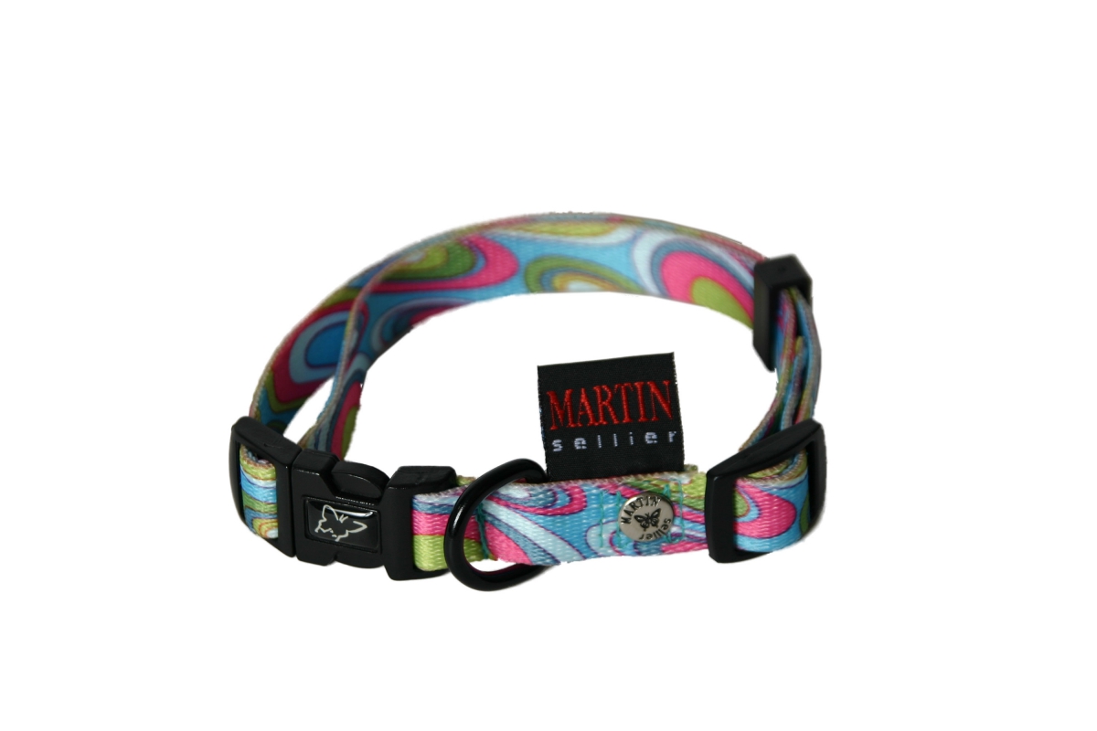 Nylon imprimé avec motif Sixties. Accessoires laqués noir. Boucle rapide.
