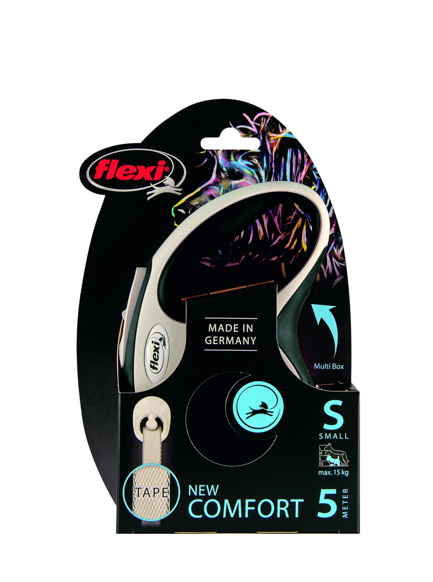 Cordon de 3 - 5 et 8 m. Mousqueton chromé. Pour les laisses S - M de 5 et 8 mètres : composants soft et réfléchissants, connexion pour des sangles interchangeables, poignée ajustable