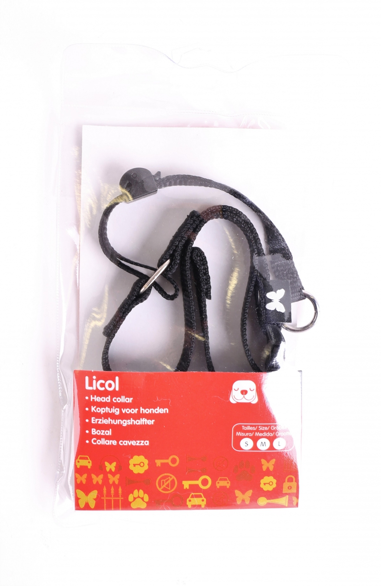 Licol de dressage et de contrôle du chien. Permet d’apprendre au chien à marcher sans tirer sur la laisse. Une légère traction suffit pour maîtriser et guider le chien : en tirant sur la laisse, le licol fait pivoter la tête du chien vers le bas, l’obligeant à vous regarder. Passer le museau en premier, puis attacher le collier. La taille en centimètres correspond au tour de museau du chien. S - Max 28 cm Chihuahua, Yorkshire… 11980 M - Max 40 cm Border Collie, Coker, Epagneul, Boxer, Bouledogue français… 11981 L - Max 48 cm Golden Retriever, Berger allemand… 11982