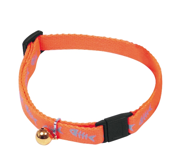Largeur 10mm. Longeur 25 à 35cm. Nylon avec motifs poisson réfléchissant. Boucle de sécurité anti-étranglement.