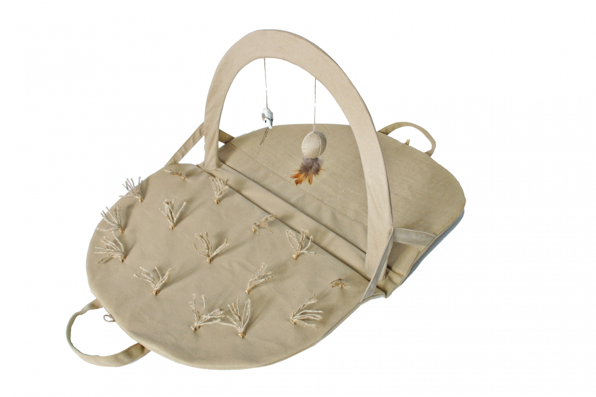 Tapis de jeu rigide en fibre végétale pour chat. Pliable et transportable avec poignée. Avec arceau et jouets en coton et plumes suspendus. Dimensions : fermé 50 x 30 x 5 cm / ouvert 70 x 50 x 33 cm
