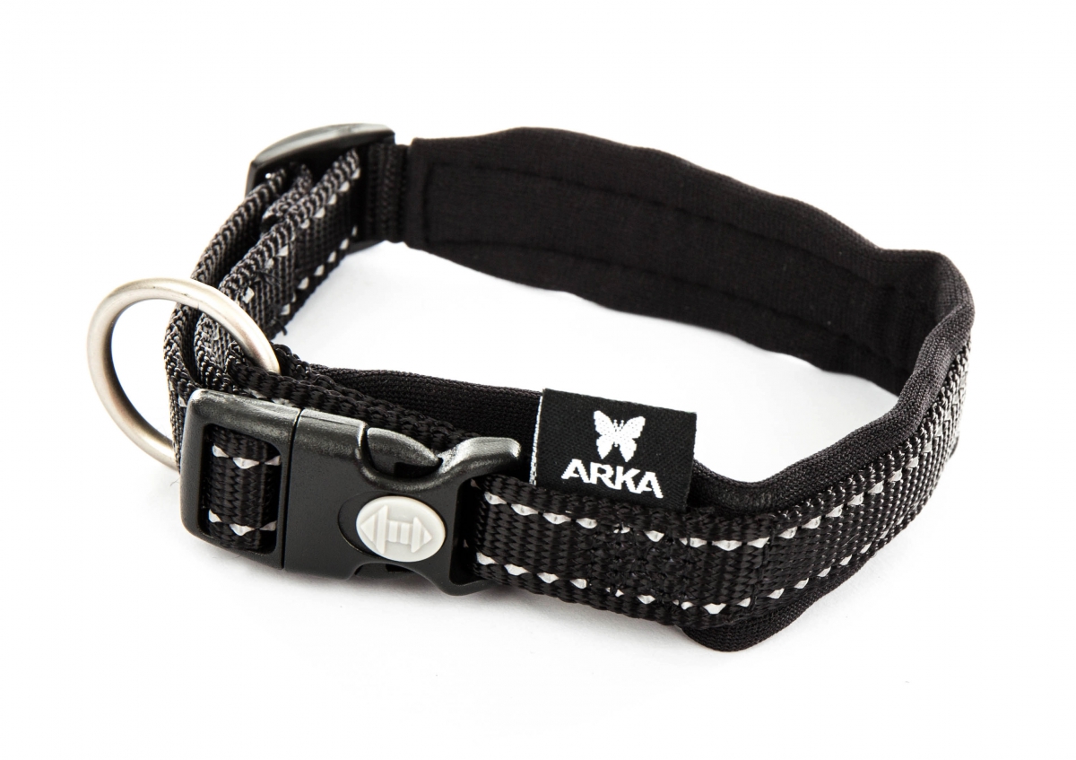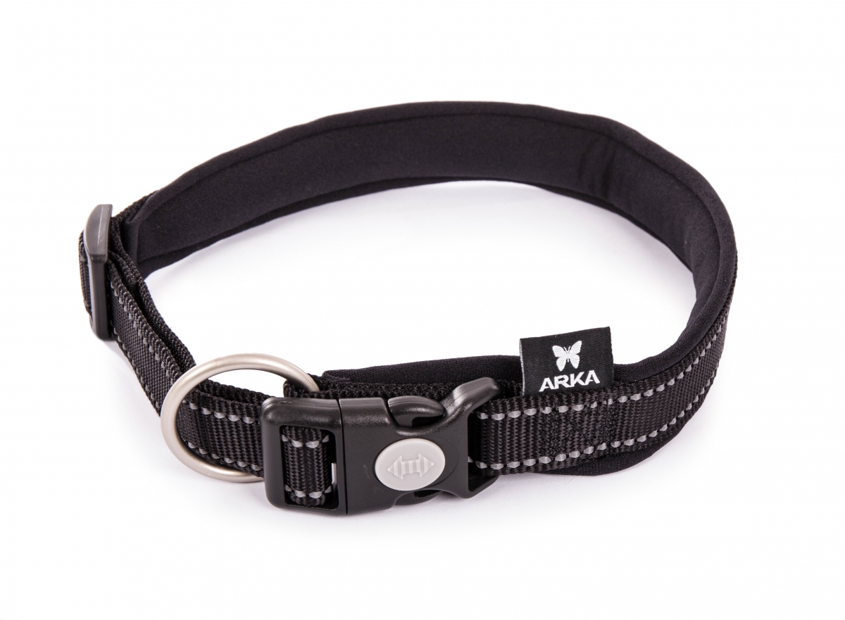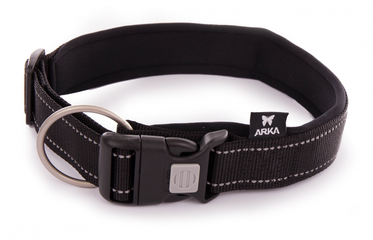 Collier réglable Neo+ en nylon, doublé de néoprène pour un confort optimal, coutures réfléchissantes, la force de traction est mieux répartie grâce à l'anneau de fixation sur le côté, accessoires plastiques
