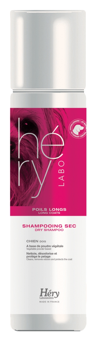 Shampooing sec Héry Poils Longs pour chien, nettoie, désodorise et protège le pelage. Formule à base de poudre végétale.