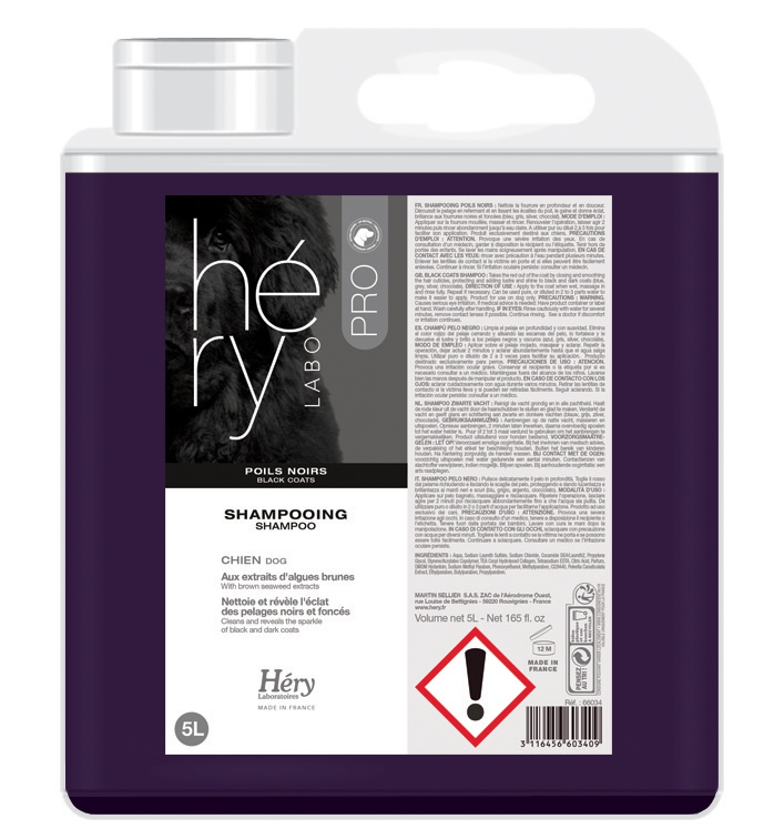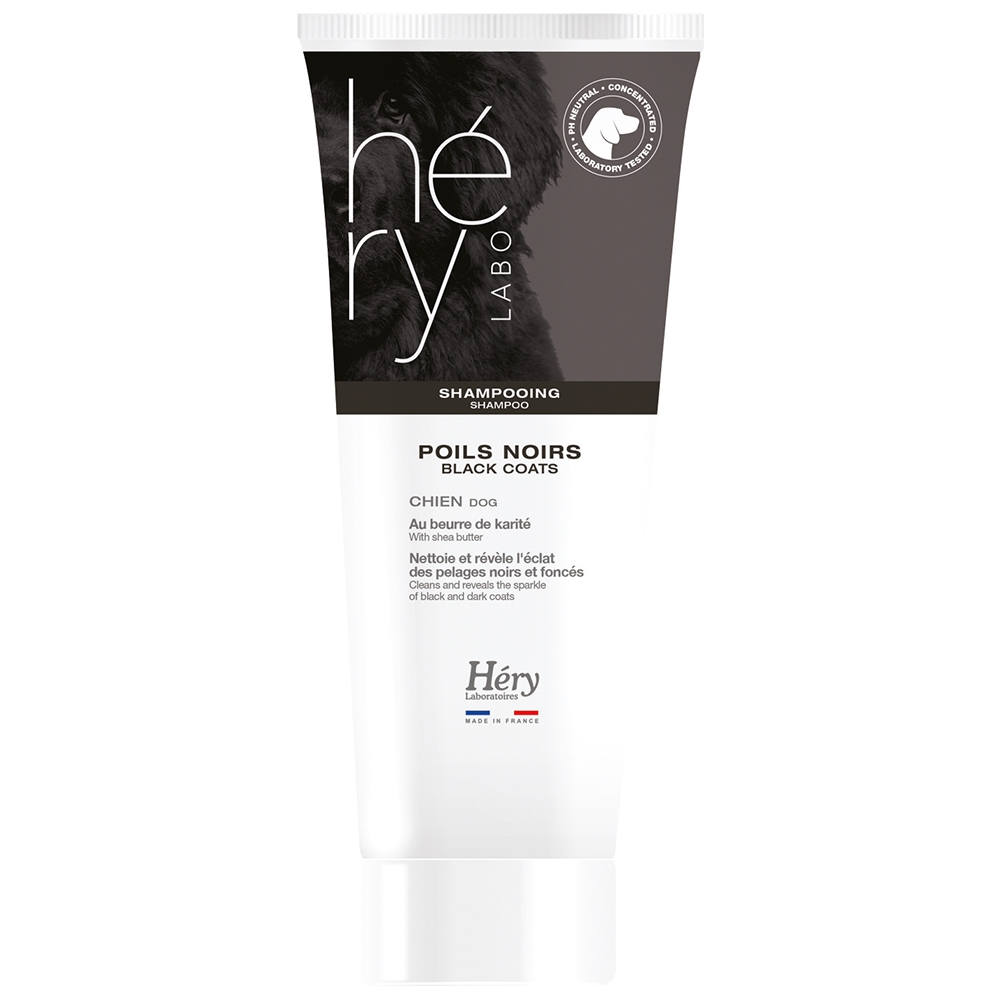 Shampooing pour Chien, Poils Noirs, Héry. Nettoie et révèle l'éclat des pelages noirs et foncés. Au beurre de karité.