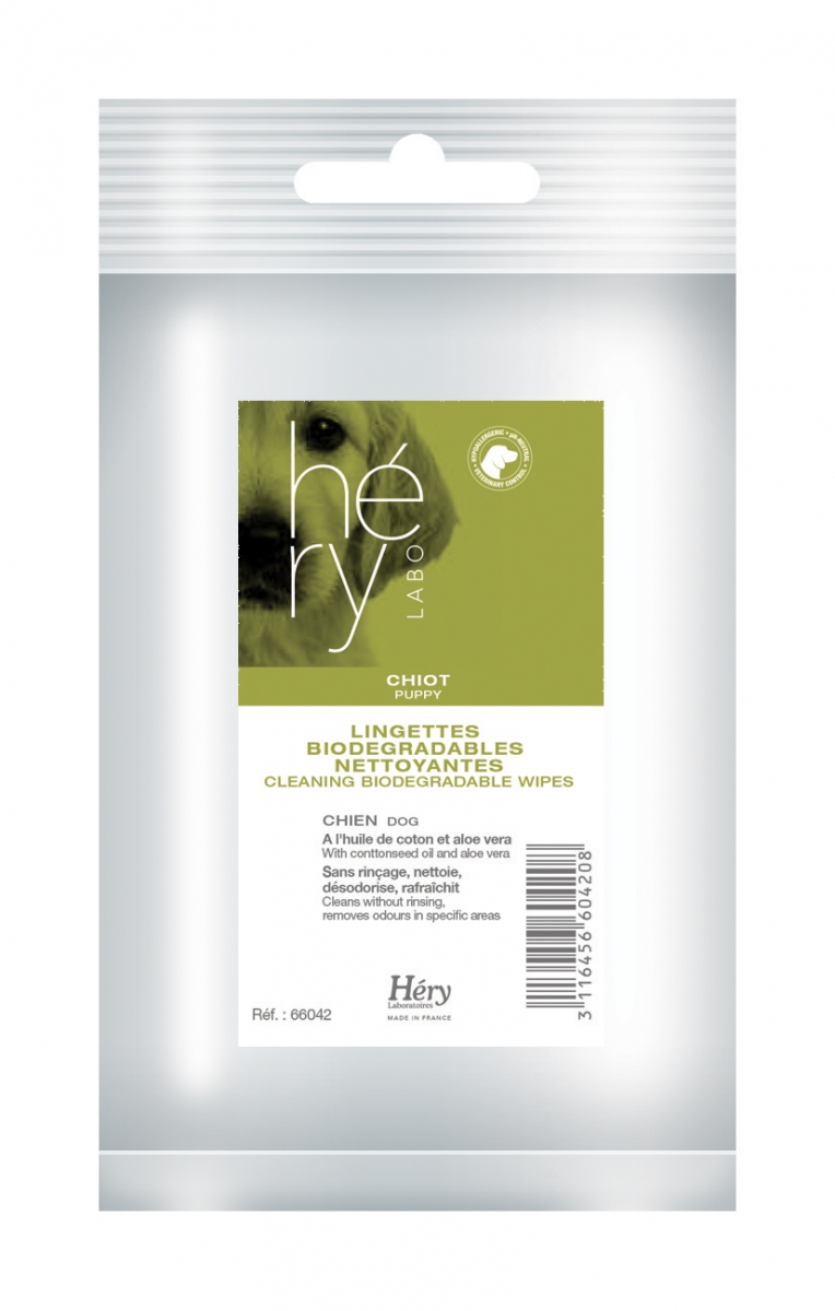 Lingettes nettoyantes pour Chiot Héry. Sans rinçage, nettoie, désodorise, rafraîchit. A l'huile de coton et aloé véra.