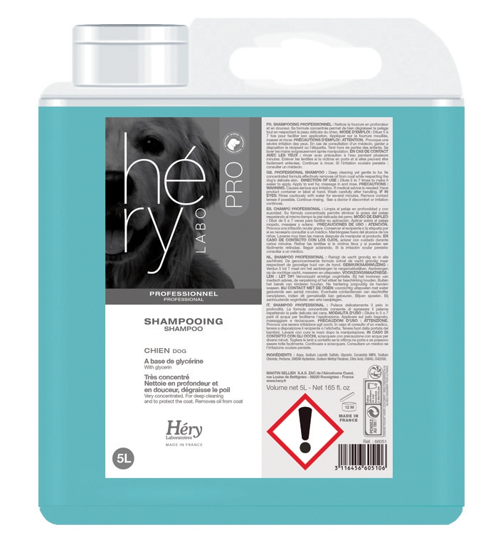 Shampooing pour chien Professionnel Héry. Très concentré. Nettoie en profondeur et en douceur, dégraisse le poil. A base de glycérine.