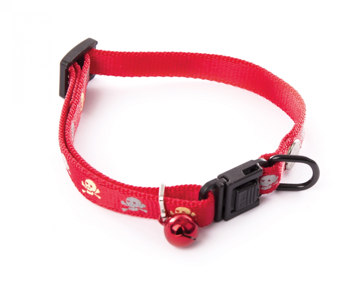 Collier réglable nylon "Tête de mort" et réfléchissant avec grelot et boucle sécurité anti-étranglement