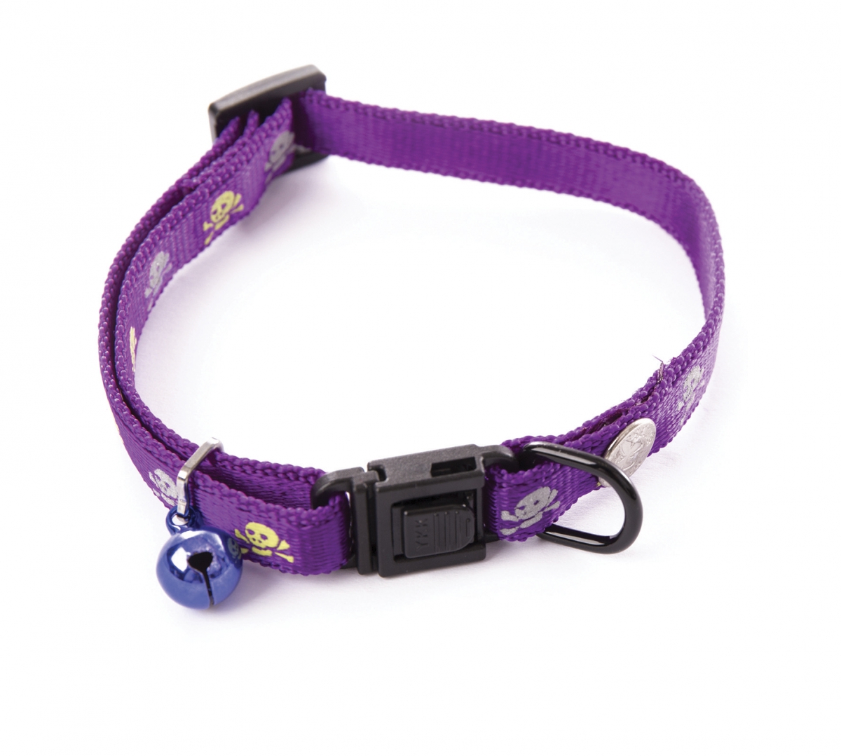 Collier réglable nylon "Tête de mort" et réfléchissant avec grelot et boucle sécurité anti-étranglement