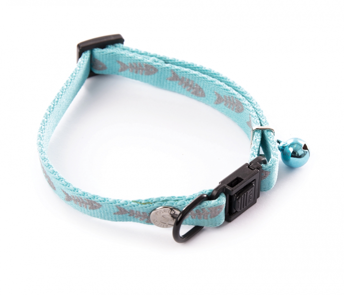 Collier réglable nylon "Poisson" pour chat réfléchissant avec grelot et boucle sécurité anti-étranglement.