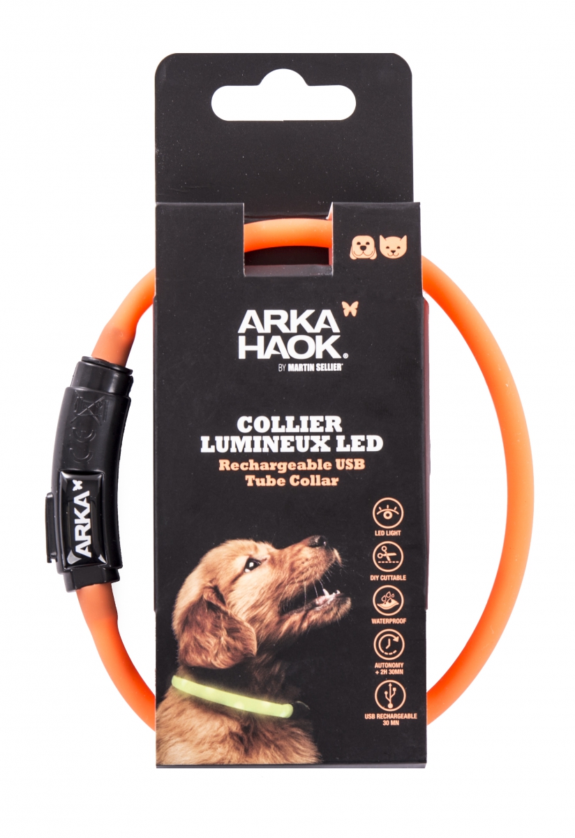Collier lumineux tube. Ajustable par une simple découpe. Rechargeable via câble USB inclus.