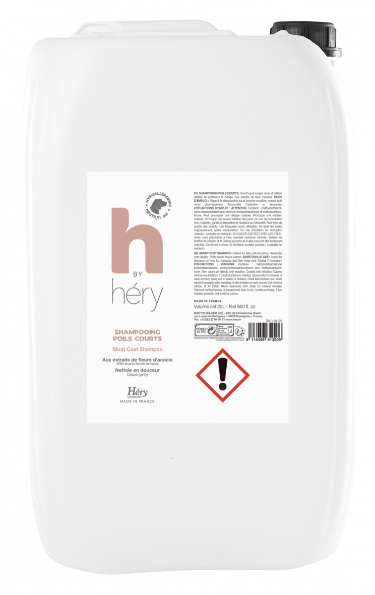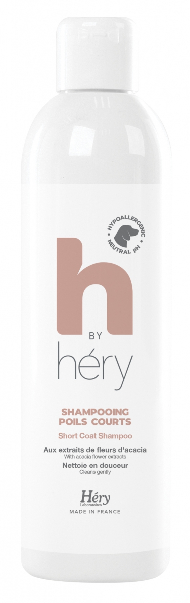 Shampooing Poils courts à la fleur d’acacia : rend le poil souple, doux et brillant. Nettoie en profondeur le pelage.
