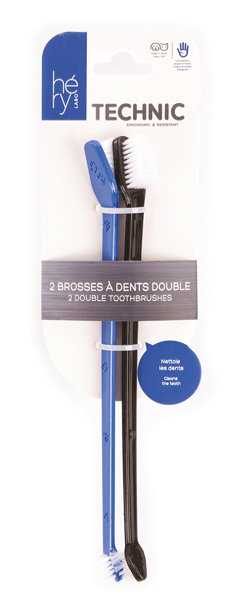 La brosse à dents double dispose d’une tête large pour les dents avant et d’une tête courte pour les molaires. Elle permet d’éviter la formation de plaque dentaire responsable de la mauvaise haleine, et prévient l’apparition de tartre. Vendu par 2.