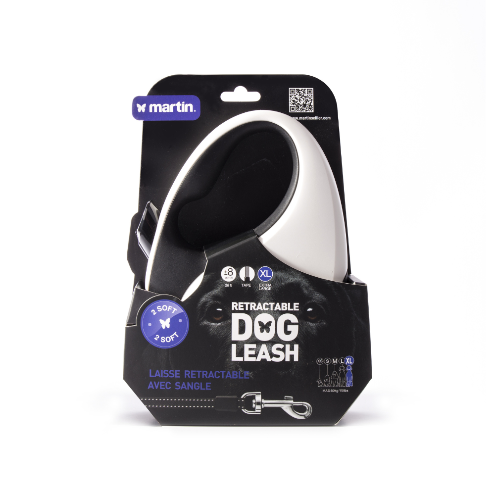 Laisse sangle réfléchissante noire. Bi-matière pour plus de confort pour la prise en main. D-lock système de frein. Mousquetons chromés. Animal jusqu’à 50 kg.