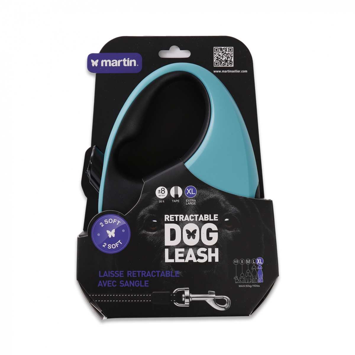 Laisse sangle réfléchissante turquoise. Bi-matière pour plus de confort pour la prise en main. D-lock système de frein. Mousquetons chromés. Animal jusqu’à 50 kg.