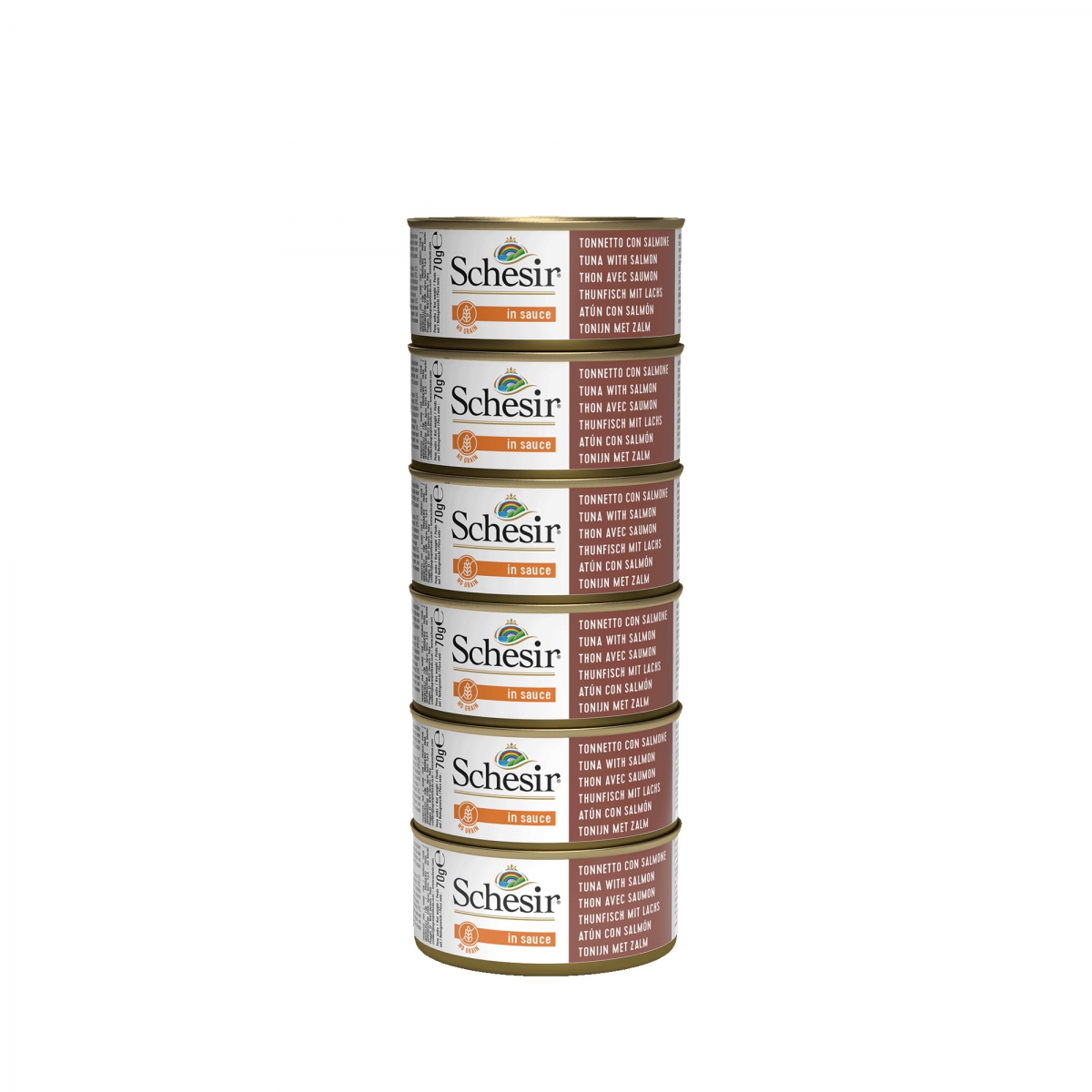 Aliment complémentaire naturel pour chat adulte, en sauce - pack de 6 boites de 70g SCHESIR La recette est à base de vrais filets de thon délicieux, rendue encore plus alléchante par une garniture de saumon savoureux préparée dans une sauce appétissante.